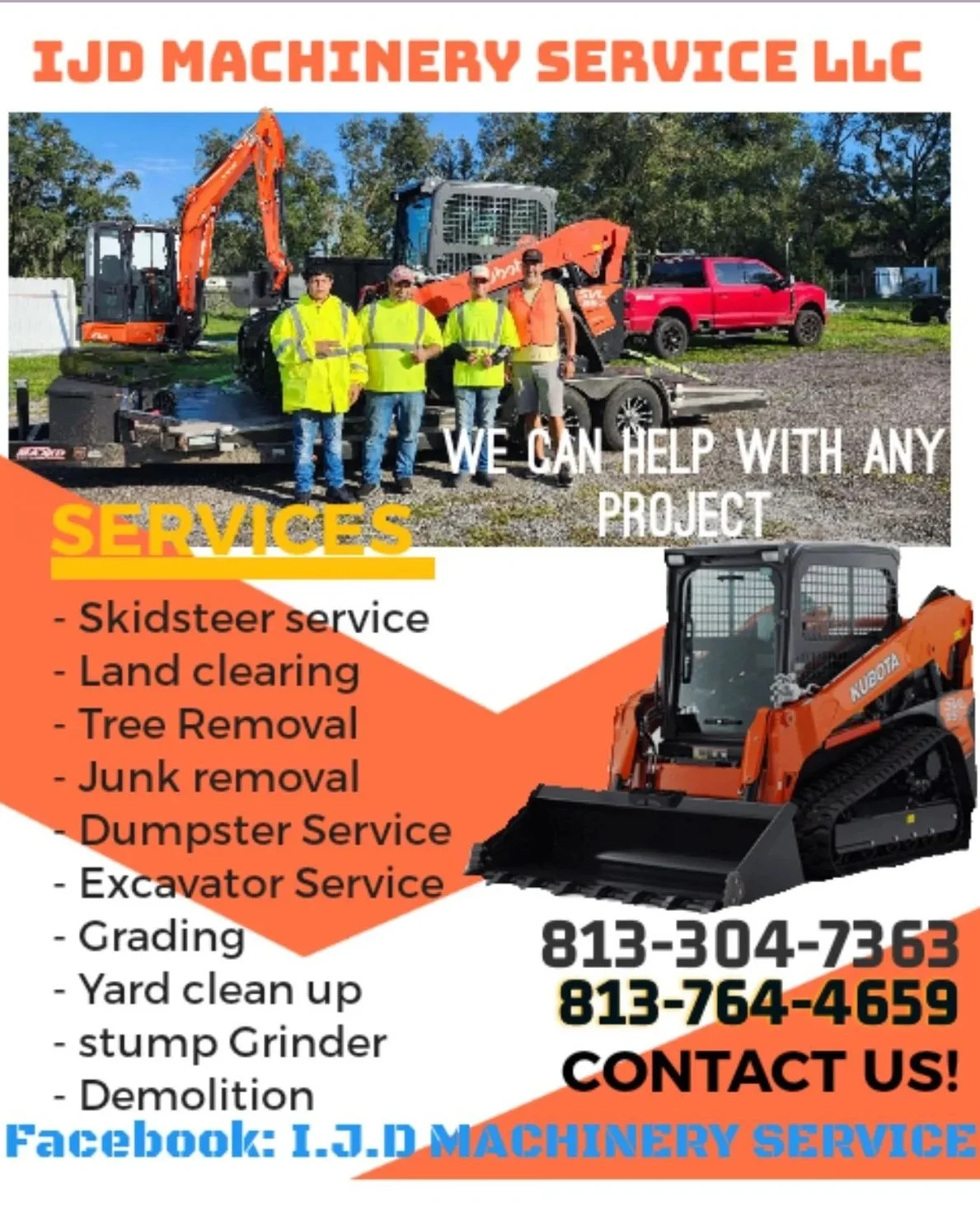I.J.D Machinery Service LLC is a proud family-owned and Latino-owned business serving the Tampa Bay area. Built on hard work, trust, and community values, we treat every project like it’s our own property. From hauling junk to clearing land and demolition, our team delivers fast, reliable results with the personal touch only a family business can provide.